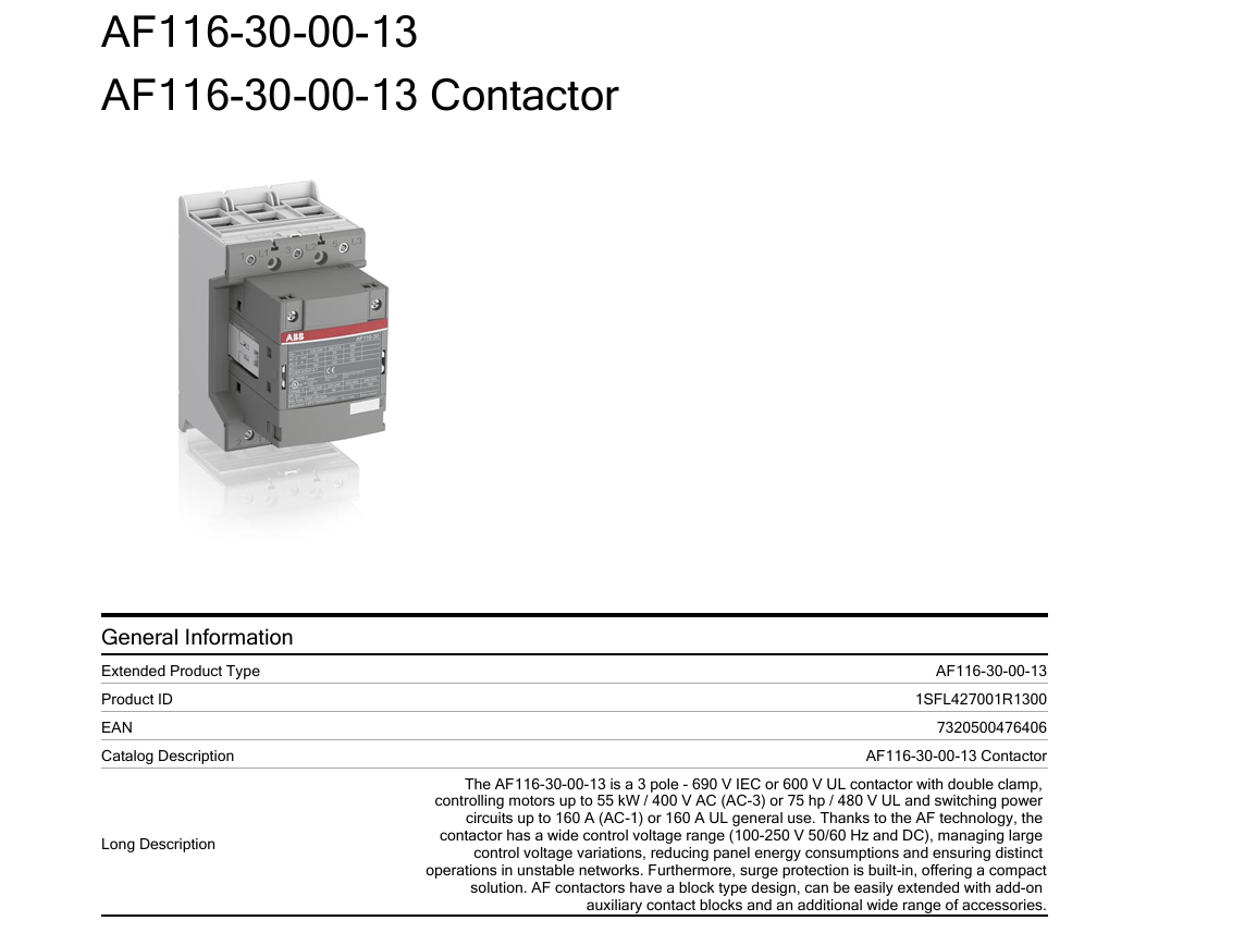 - Product Model: AF116-30-00-13 (Ordering Part Number: 1SFL427001R1300)