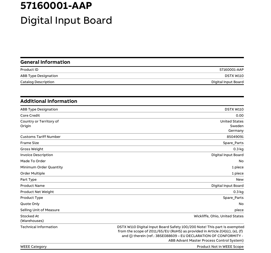 - Use only ABB-genuine DSTX-W110 57160001-AAP modules—counterfeit units lack proper isolation and noise filtering, leading to false inputs (e.g., "CH5 Active" when no sensor signal is present) or controller damage from voltage transients.