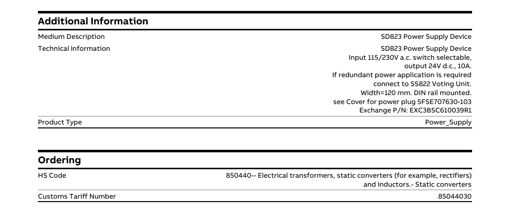 The ABB SD823 is a high-power, industrial-grade power supply module tailored for ABB’s AC 800M Distributed Control System (DCS) and S100 I/O platforms. As an upgraded variant of the SD822, it delivers higher output current to support dense control cabinets with multiple modules (e.g., high-channel I/O racks, redundant controllers, or multi-protocol communication interfaces). Designed for harsh industrial environments, it features a wide input voltage range, robust protection mechanisms, and redundancy support—ensuring stable 24V DC power for mission-critical processes in power generation, petrochemicals, metallurgy, and large-scale water treatment plants where high load capacity and uninterrupted operation are non-negotiable.