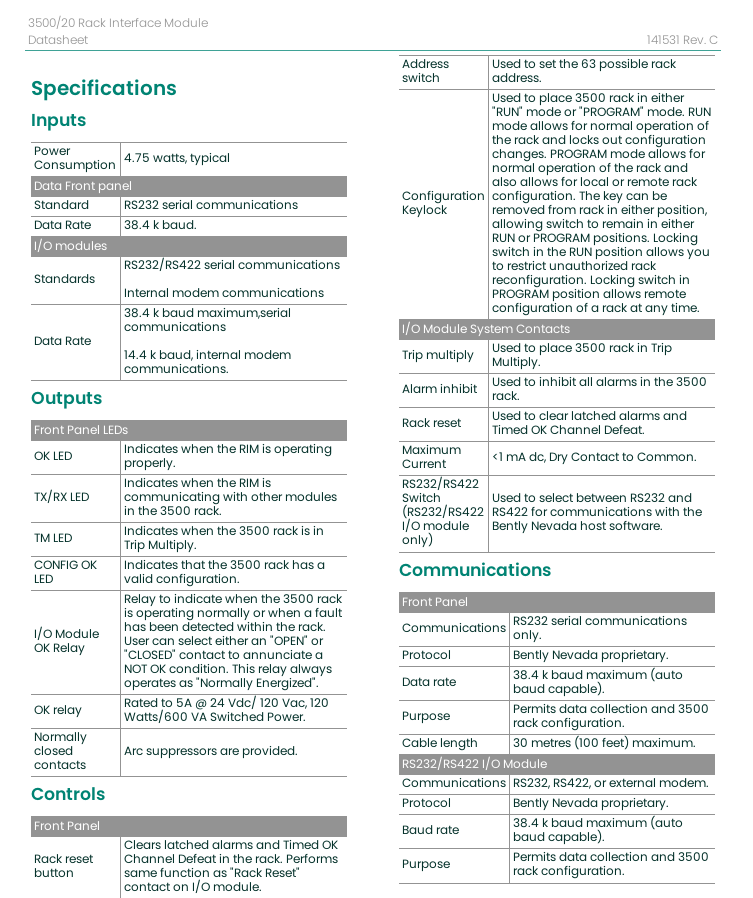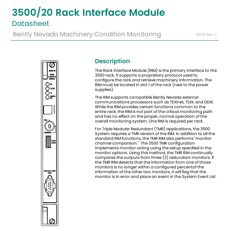 The 3500/20 is a rack interface module (RIM) that serves as the primary communication interface for Bently Nevada’s 3500 series machinery protection systems. It enables configuration, data retrieval, and communication between the 3500 rack and external systems (e.g., DCS, SCADA) using Bently Nevada’s proprietary protocols .